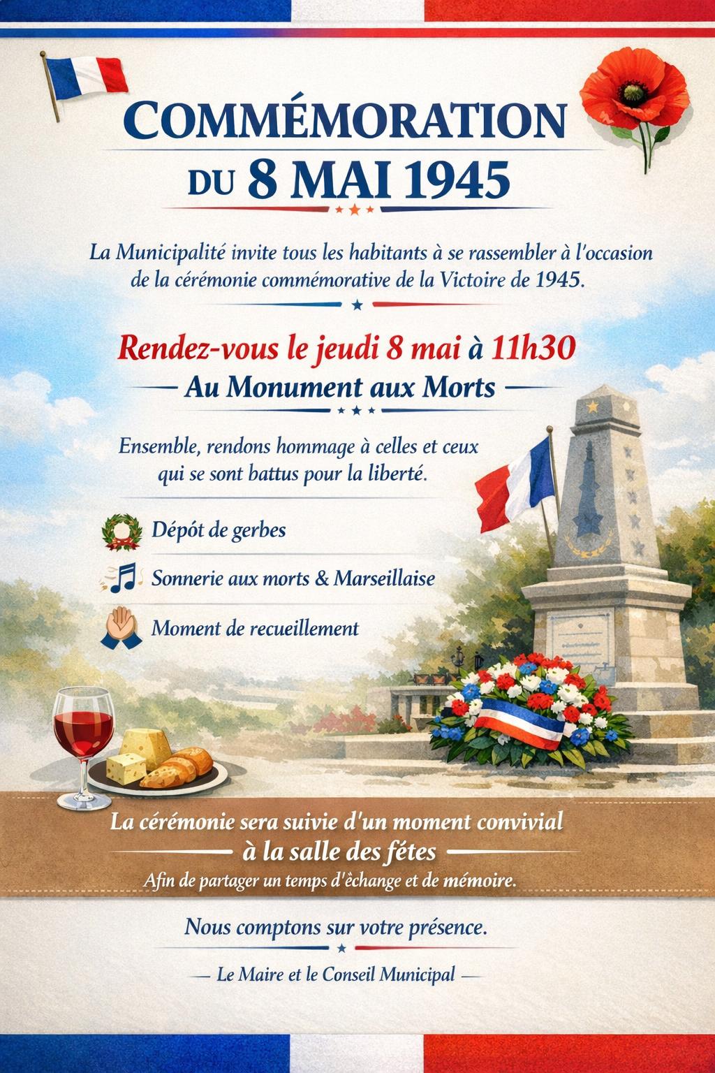 La municipalité invite tous les habitants à se rassembler lors de la cérémonie du 8 mai, à rendre hommage à celles et ceux qui se sont battus pour la liberté, à 11h30 au Monument aux Morts. La cérémonie sera suivie d'un moment convivial la Salle des fêtes.